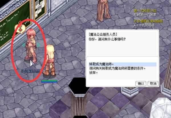 按照地面上的引导路径移动,【公会服务人员】对话,即可完成第一次转职。