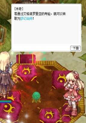 正在迷茫之时,这时米奇也刚巧来到这里,告知玩家完成艾格诺罗里亚的测试,可以转职成梦幻法师。