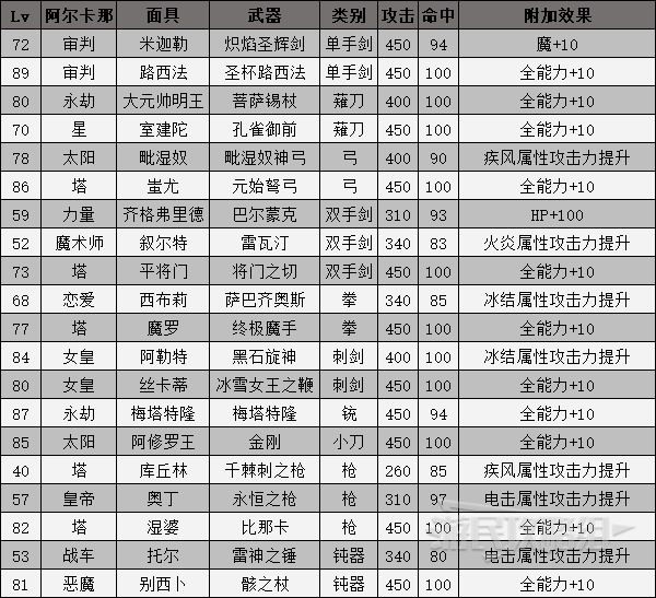 合成用面具为「愚者」时,攻击固定为1,命中固定为99,属性变化则各不相同。