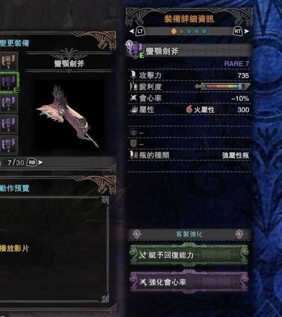 这是一把兼得面板和属性的斩斧,300+属性瓶的火属性不高不低,735的面板倒是挺高的,不过是属性瓶,所以物理部分不会太强。