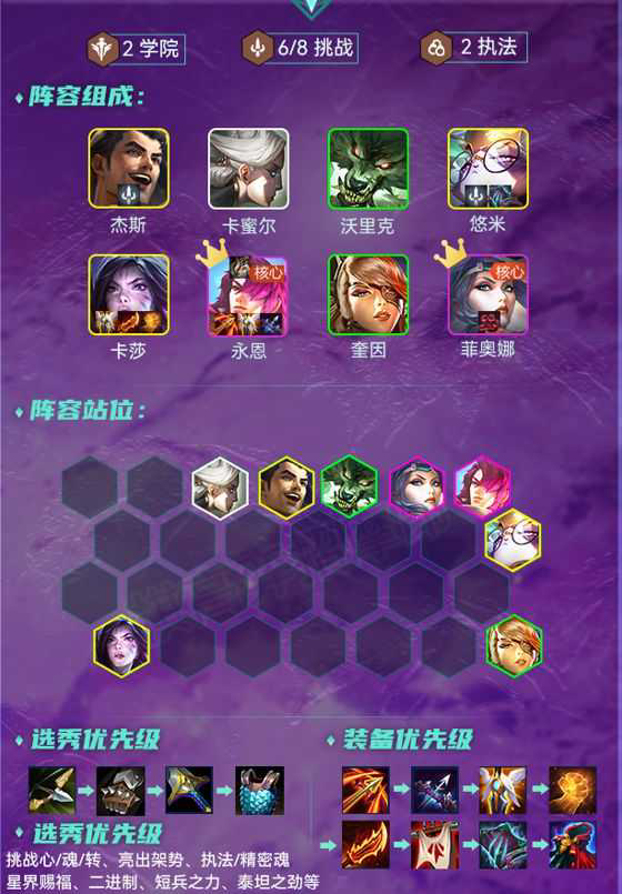阵容方面变化不大,依然是6/8挑战+布隆/杰斯与悠米的组合,装备上考虑主C永恩的装备,飓风+复活甲+泰坦/轻语。