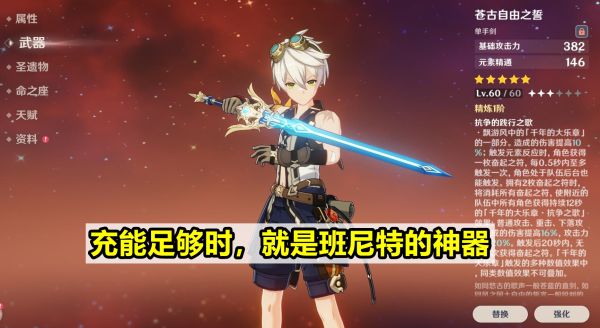 90级【苍古剑】拥有608点基础攻击力和198点元素精通,单击力低于【风鹰剑】,与【天空剑】和【斫峰剑】并列第二,精练1时为角色提供10%的伤害加成,每次触发元素反应获得1层标记,2层标记时提升全队的普攻、重击、下坠攻击伤害16%,同时提升20%的攻击力,轮辅助能力没有其他单手剑可比,但若论对团队整体输出的提升效果,却很出乎意料。