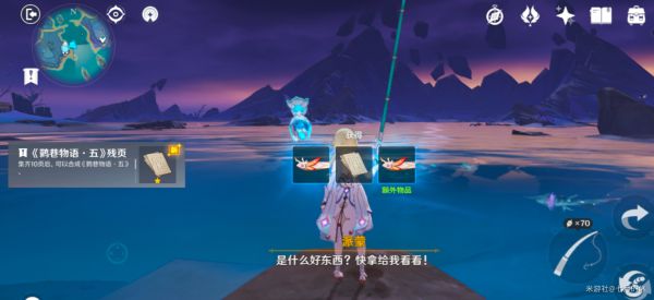 3.前4本,在稻妻地图上探索可以找到50个「神秘的书页」,《鹮巷物语·五》的10页残页,需要在稻妻钓鱼点钓鱼,看运气获得,大概需要钓200——400次左右!(ps:数据没有实际测试支撑,只是通过自己的收集以及部分粉丝的分享,大概估略出所得!)