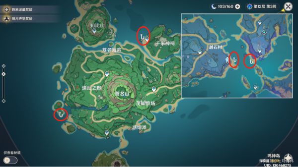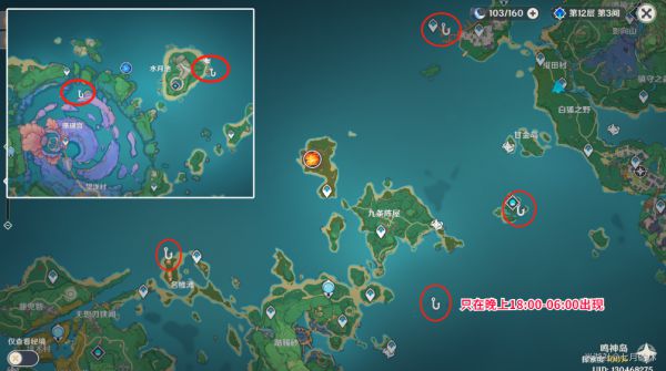1.目前版本稻妻一共13个钓鱼点位,其中雷鸣仙,只在晚上18:00-6:00出现。