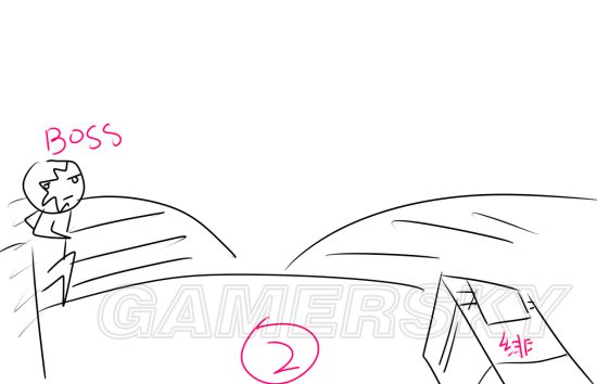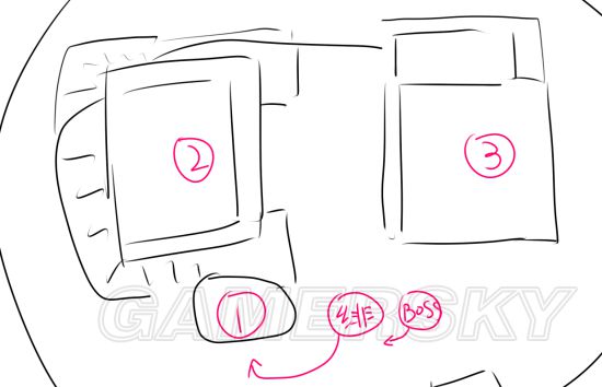 首先先从①跳上来跳到②,如图(和BOSS保持一定距离,BOSS的移动速度比绯丝慢一点,尤其是不会跳)