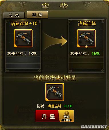 通过消耗五铢或者元宝, 以提升宝物品质,进阶宝物的属性与等级,宝物每升十级可以升星一次!满星五星!升星后大幅提升宝物属性!