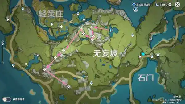 清心这玩意挺难采集的,都在山头上,推荐每3天采集一下路线1,一次可以采集10个,只用2分钟。