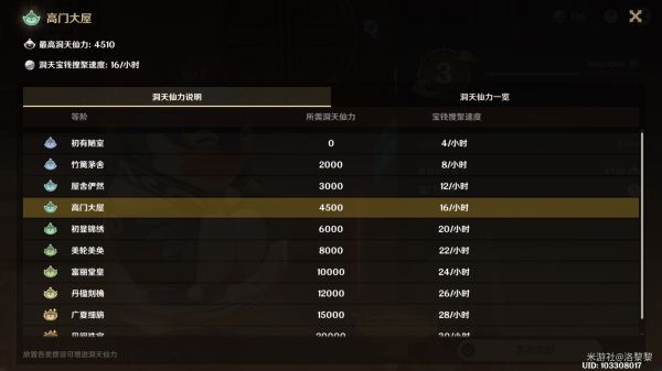 个人感觉要在尘歌壶系统中快人一步,最重要的是洞天宝钱的累积,要尽快提高洞天仙力。楼主目前刚好过4500,应该也是目前能达到的最高的等阶。