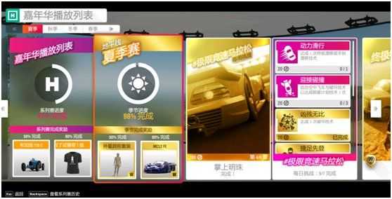 A:左侧的系列赛进度是夏秋冬春四季的总进度,右边的是当前季节的进度与奖励,如果你新点进去,你会发现你的列表与上图有些不同,你的颜色是粉色,就如同本图“极限竞速马拉松”每日挑战:动力滑行,迎接碰撞一个颜色,代表你还未完成的比赛,如果你已经完成,便会变成金色,同时增加季节进度。