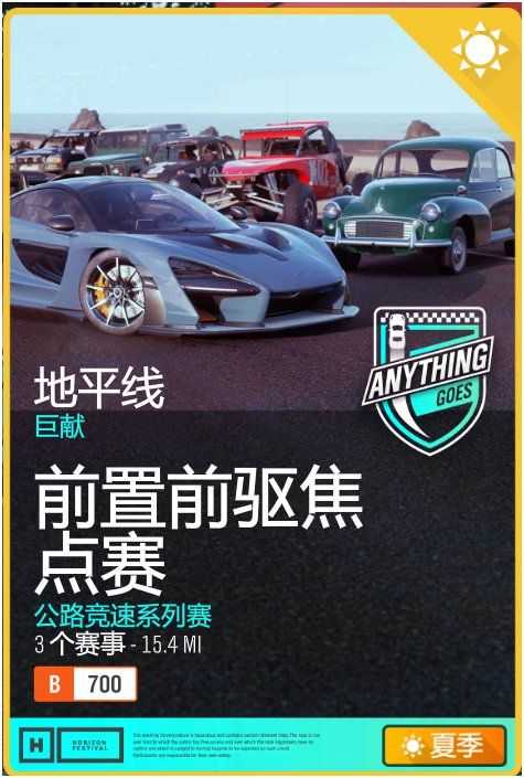 A:用前置前驱焦点赛距离:你可以看到左下角的B700,意味着你的车辆性能分数不得超过700分,并且前置前驱焦点赛,意味着你只能用前置前驱的车辆,后驱四驱都是不行的
