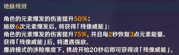 提供一个大幅提升元素爆发伤害的BUFF,释放6次元素爆发后,会获得一个更强的BUFF,残像威能,并遭遇强敌。