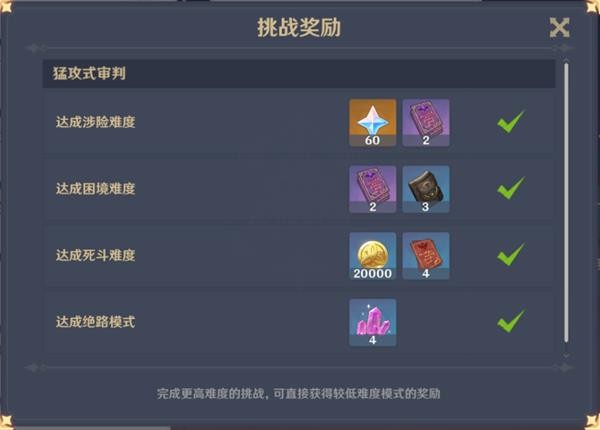 原石奖励还是放在最低的一档。后续三个挑战给的奖励,折合后约为20树脂。7日挑战共可获得420原石。
