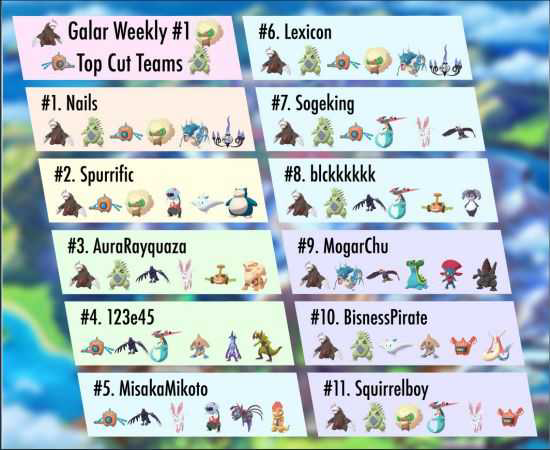 VGC举办了第一次以剑盾为平台的比赛,以下为使用率排名以及前11名选手队伍一览。