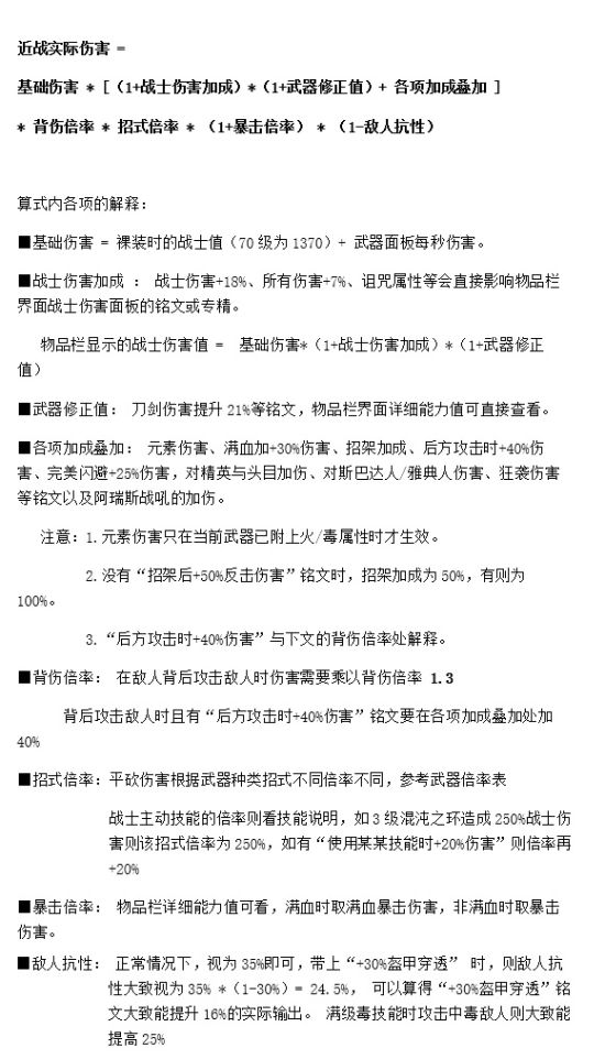 整体的算式还是很粗略,特别是敌人抗性方面,还有很多东西也并没有逐一去测试,比如“使用某某技能时+20%伤害”的铭文,我也只测了两个技能,其他技能并没有测试。