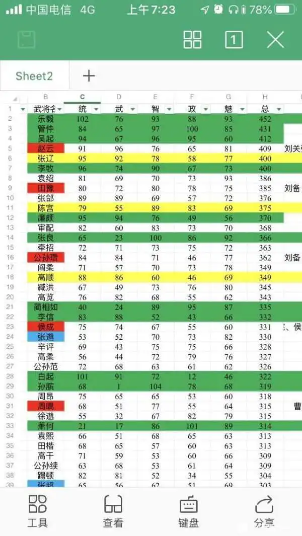 为此不得不祭出,excel的求和排序功能。现在基本确定太守是城里五围之和最高的那位担当。所以我把手下武将列表,黄色代表有亲善关系的。当我要其中某人当太守,必须派属性在他之下武将陪同。为了保证城的安全,基建慢一点也忍了。大不了,等强者建设高别的城,再整编制换驻。