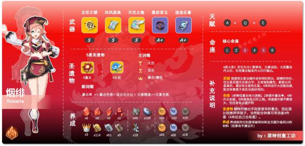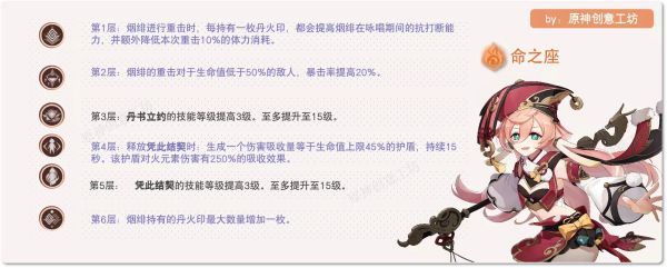 从大招持续15秒,以及输出大部分靠普攻和重击可以看出,烟绯属于站场主C,命座则可以提高部分输出。