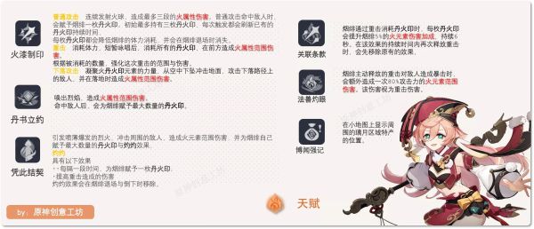 特殊机制:丹火印:降低重击体力消耗,提高重击伤害和范围。因此,该角色的打法,都是围绕这个特殊机制打的。