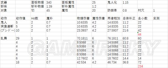 火2本身带个单独值6,再重新代入计算好麻烦啊,不如我们索性把火2(1.1+6)+属强(1.1)看做加成1.35吧,虽然这样算出的结果,肯定是大于实际值的,不过无所谓了。那么鬼人化小陀螺就是44.4*1.35*1.25=74.9,乱舞就是120.5*1.35*1.25=203.3。