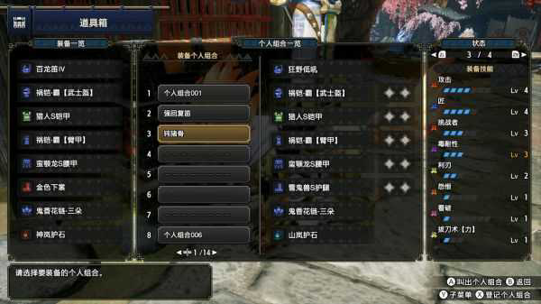 由于这次笛子的攻击段数变得非常多,斩味掉得飞快,业物成了刚需。于是配装思路是先把斩味顶上去,吹笛名人和耐冲惯例塞好,然后堆攻击和会心。现阶段我能做得出来的,而且用得比较舒服的输出型笛子装有三套,两套普通素材武器,一套百龙武器。