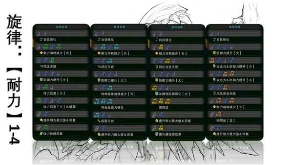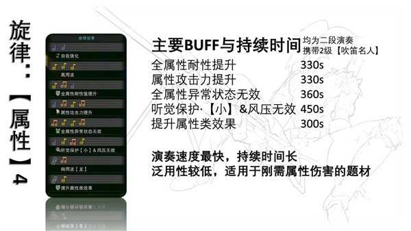 上述这十四种旋律,要么因为无法快速演奏,要么buff本身加成低下,或者部分旋律泛用性低,导致不适合大多数场合,因此使用率较低。
