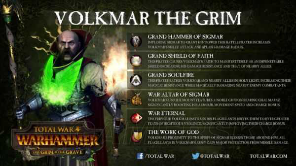 《战锤全面战争》新DLC中将volkmar部队也加入了战斗,那么volkmar部队都有什么技能呢?下面小编就为大家带来《战锤全面战争》阴冷墓穴DLC Volkmar The Grim技能介绍,快来一起看看吧。