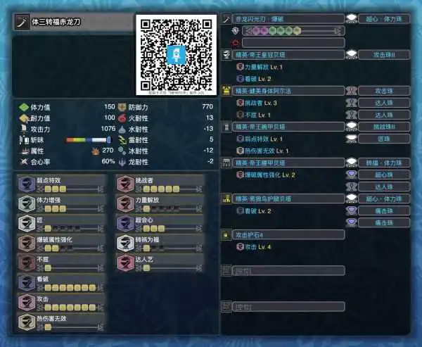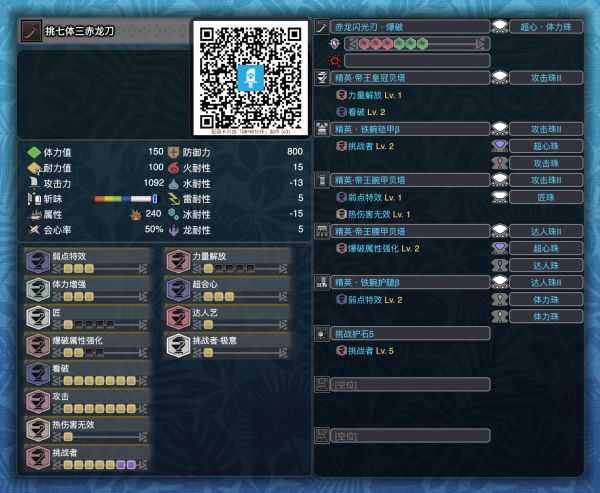 赤龙刀全客制攻击吸血,因为挑7的存在,客制攻击也能怒后无软化弱点满会了,没啥必要客制会心了(真要开心就是莽的也可以客会心~