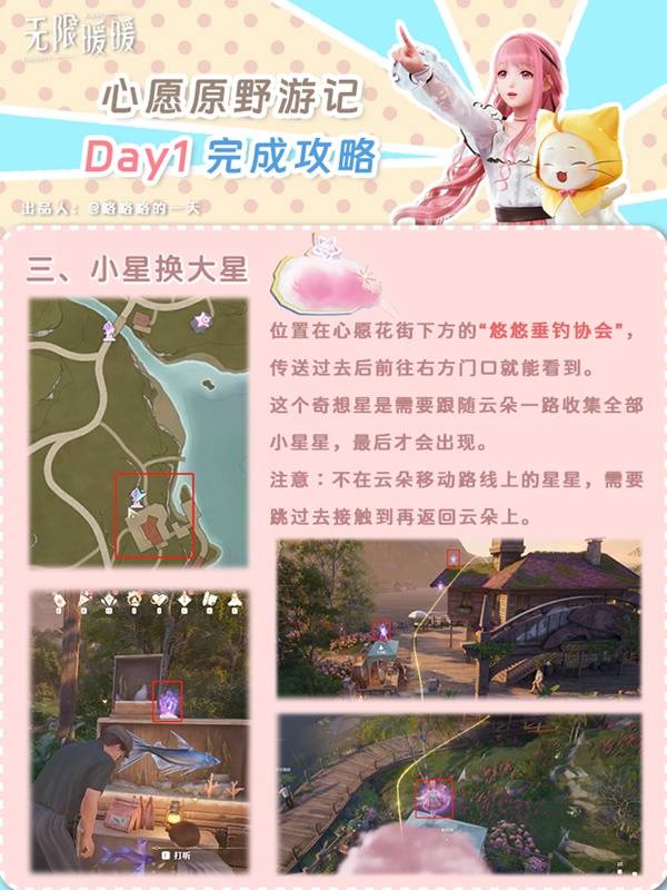 Day1的任务主要围绕“奇想星的获取”展开,四种任务对应四种不同的获取方式:寻找星形、大世界交互获取、集小换大、捕捉奇想蝶。除了这四种,目前获取奇想星的方式还有谜题空间、清洁奇想貂、钓奇想鱼等等,就等着搭配师们一一尝试啦!