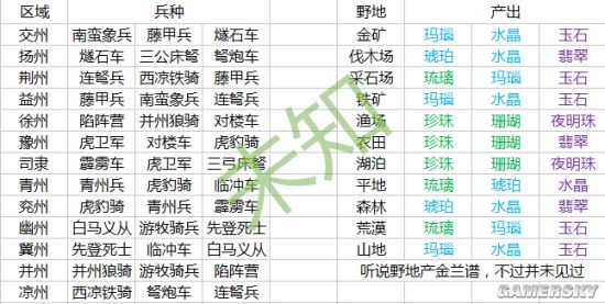 ③:县城(第一个占领可获恭喜,奖励经验和300声望):城内建筑等级30级,城外建筑等级35级,单种资源基础产值8万/小时,人口上限9万6,黄金产量9600/小时。可根据县城所在州招募各州独有特种兵。爵位要求:公乘