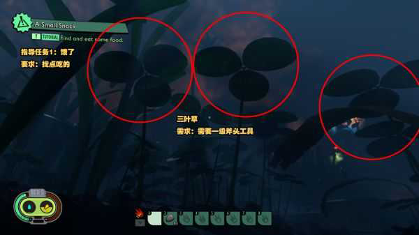 寻找并拾取三叶草三个,三叶草需要斧头来收割。