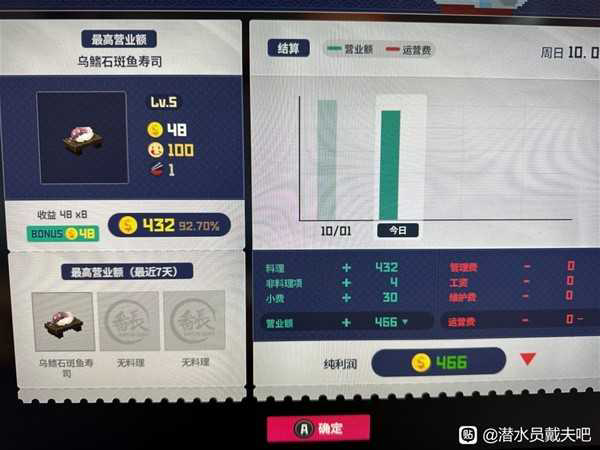 注意老头会白嫖你一份菜,所以第一天晚上先准备一份蓝倒吊寿司给他,然后准备9份石斑鱼寿司迎客,第一天收入509。