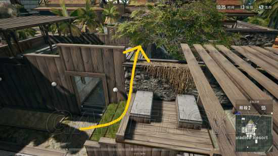 这张图可以清楚的看到如何从这个位置上酒店屋檐,然后利用屋檐到酒店的露天的二楼,击杀在二楼守楼梯口的敌人。怎么样,学到了么,那么赶快去游戏里实践吧,当你利用这种方法击杀敌人时一定会很满足的!