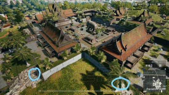如图所示的两个位置视野相当好,占据这里很有优势,不过很多人知道这个点位,所以也变成兵家必争之地,容易被夹击,顾此失彼。如果我们占据这里,最好先是专注打一边。