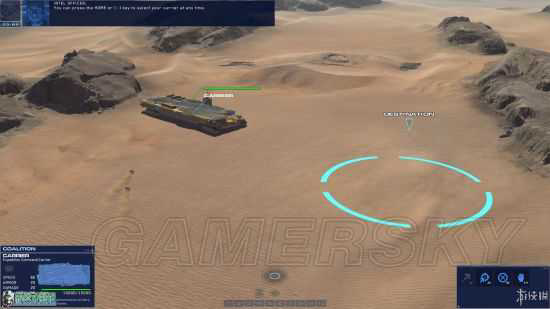 基本操作说明完毕后,视角转换到了沙漠母舰,沙漠母舰实际上相当于玩家的主基地,它可以生产各种单位,包括采集单位和战斗单位。母舰跟LAV一样可以进行移动。
