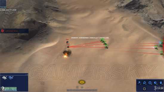进入关卡之后,画面之中会出现两辆LAV,这是一种速度很快,但是射程较近的轻型攻击单位。鼠标左键选中单位,右键控制其移动。按住鼠标左键并且拉出选框可以一次选中多个单位,双击LAV可以选中地图上所有的LAV,跟一般的RTS游戏操作并无二致。