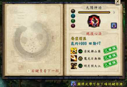 「乾坤大挪移」不愧是明教绝学,这招学了几本上游戏可以说全破了,四劲齐发,每重气内+700外带+3四劲。