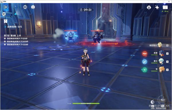 这次我还是挑选的深渊第七层,深渊额外的天赋选了百分之二十的充能速度。一个E不参杂任何平A一下能回复五分之一的大招能量。如果这个E打中的敌人数量是两个那就是两倍回复。这个回复速率在实战中其他角色有辅助装的情况下大招会更快。
