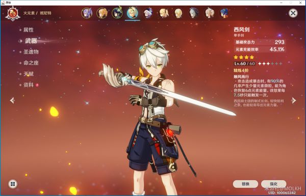 首先是武器,西风,辅助角色的不二之选,充能越快越好。