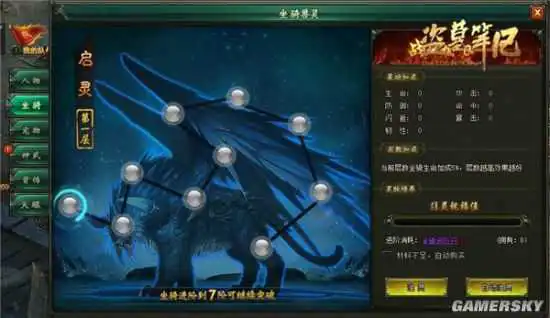 当前层数兽灵点注灵完成后,可以消耗坐骑突破丹进行升级。以第一层启灵为例,突破后则升为第二层开光。同样对应10个新的兽灵点。值得注意的是,从第一层突破到第二层,需要坐骑进阶到7阶。类似的,突破到第三层,需要坐骑达到8阶。