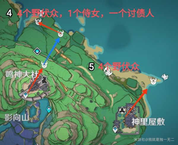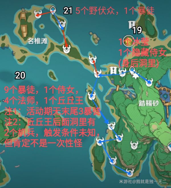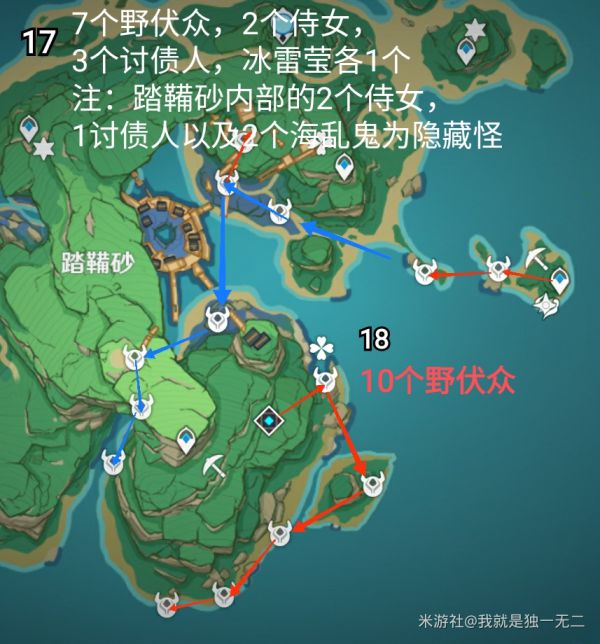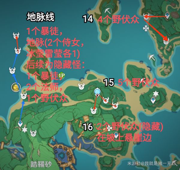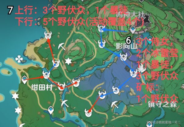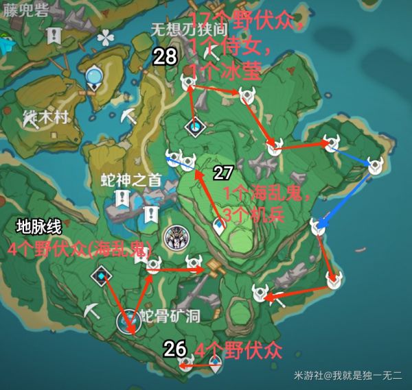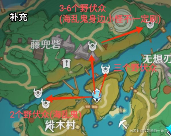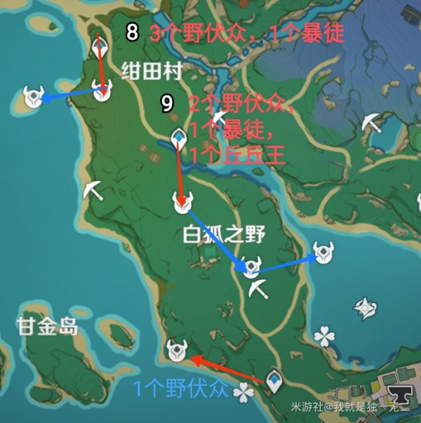 刚开新图肯定会缺材料,也可以适当屯一点以备后用。红色指向野伏众,蓝色指向精英怪,制图技术很菜,希望能帮助到有需要的人。
