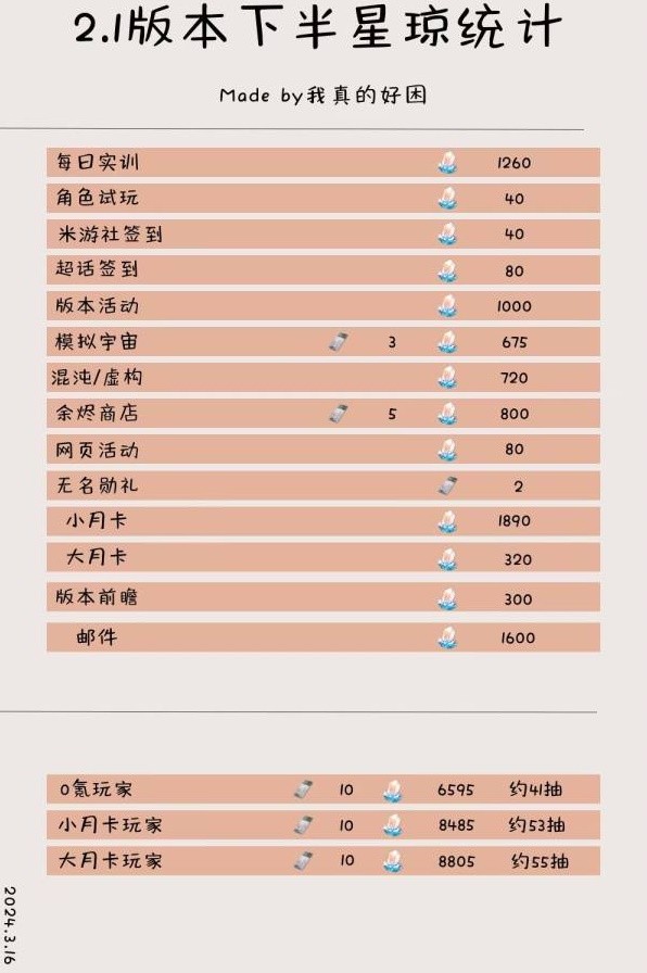 《崩坏星穹铁道》2.1下半即将更新,很多玩家想要知道接下来有多少星琼可以获得,下面请看“我真的好困t”带来的《崩坏星穹铁道》2.1下半星琼数量统计,希望能够帮助大家。