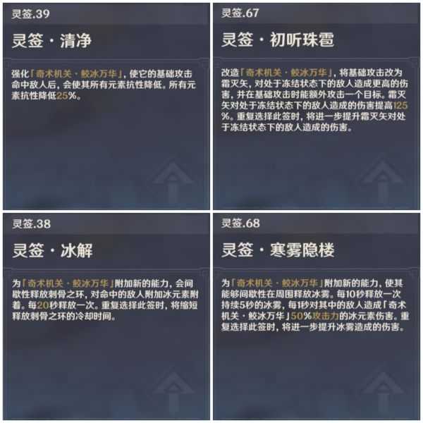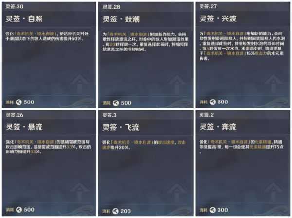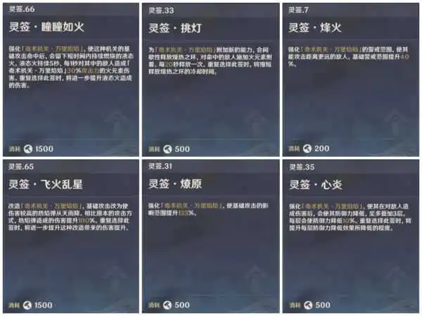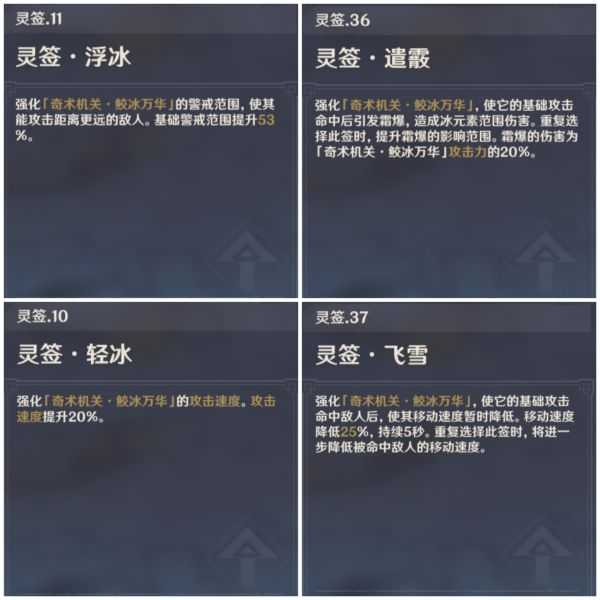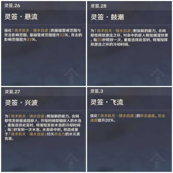 在选择灵签时,增加攻速、增加攻击范围、以及部分可增强挂元素效果、困住敌人的机关改造都是值得优先选择的,若在选择时无合适灵签,则可在队伍中携带水系角色,在部分必要情况下手动上元素。