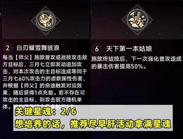 因为活动赠送满星魂,这里主要带大家认识下巡猎三月七的星魂效果。比较关键的是2魂和6魂,2魂给了三月七额外的追击伤害,更重要的是加快了充能。6魂就是简单直接的数值提升,让三月七的强化普攻伤害更高。所以推荐大家,想培养巡猎三月七的话,最好尽早肝活动拿星魂哦。