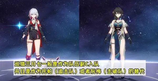 巡猎三月七的机制可以说跟技能特效一样有意思,根据师父的命途不同还会有对应的效果,而且她不仅限于一个“巡猎”,兼具削韧和辅助队友加暴伤和击破的功能。不过始终受限于四星,并且上面也提到她一般是作为托帕或者阮梅的替代入队。如果对她的机制感兴趣,并且资源比较多的话则可以培养~