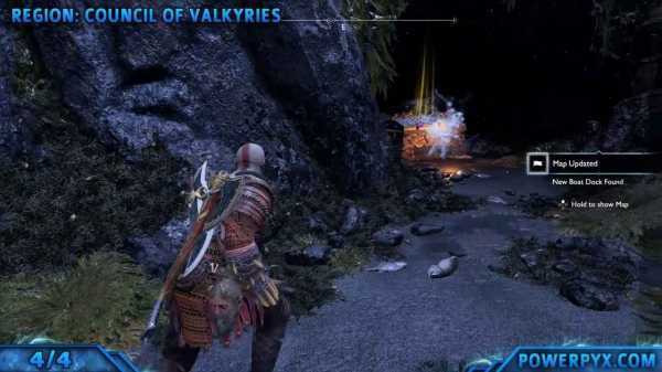 第四个碎片位于九界之湖北侧,海峡入口处有两座巨大的雕像(下方图2),雕像右边有一个小海滩,将船停在那里并上岸。爬到上边去射爆红色结晶,清理掉障碍物,然后走到里边就能发现宝箱。