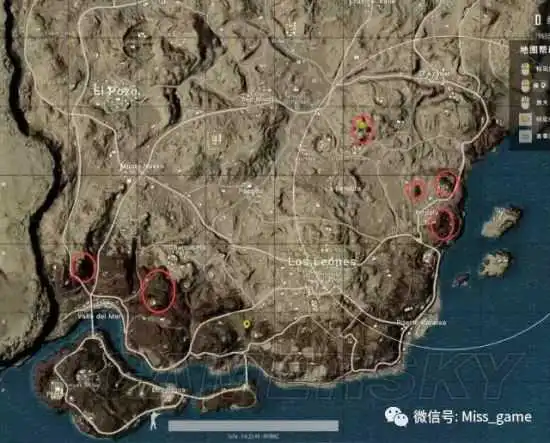 红全部分以及沙漠地图的监狱小岛都是这些背光阴影面会出现的地方,但是最为常见的还得数地图东部狮城上方的那几个红圈处,因为笔者已经不止一次见到过圈刷在这些地方然后跑毒经过的时候遇到隐藏在阴影处的幻影坦克了。