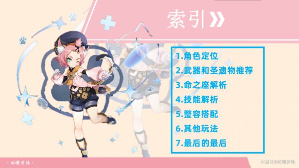 圣遗物主词条推荐:沙漏生命,杯子生命,帽子生命,如果感觉奶量不行的话建议换成治疗加成。(为什么要全带生命呢?因为猫猫的护盾量是看她自身的血量来定的)
