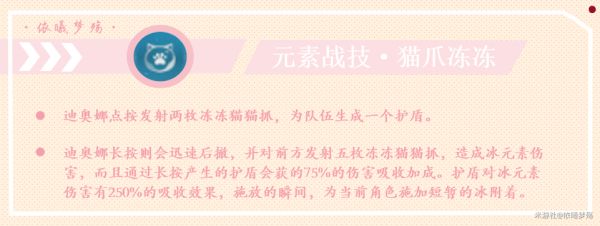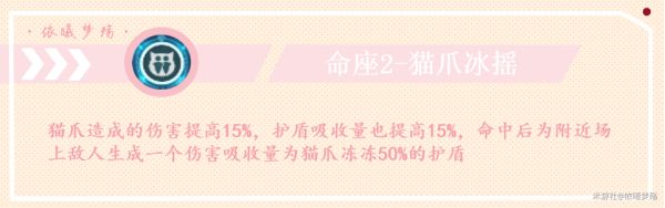 命座2层:迪奥娜开元素战技命中敌人的时候,猫猫冻爪的伤害提高15%,生成的护盾提高15%。而且迪奥娜在联机的时候也是非常快乐的,她可以为场上的队伍生成一个护盾,持续5秒(持续时间有点短)所以劲量点按。