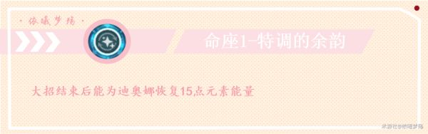 命座1层:迪奥娜大招结束后,能为迪奥娜额外恢复15点元素能量。这个命座还是比较香的,因为迪奥娜的大招需要的元素能量需要80点,那么加上命座1层,也就是说迪奥娜的元素充能只需要65点,而且祭礼弓的副词条元素充能也比西风少,所以我个人觉得1命香。