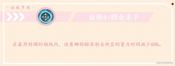 命座4层:在元素爆发(大招)的领域内,迪奥娜的射击蓄力时间将减少60%。这个命座作用并不大,但是在破雷锤盾的时候还是非常有用处的。