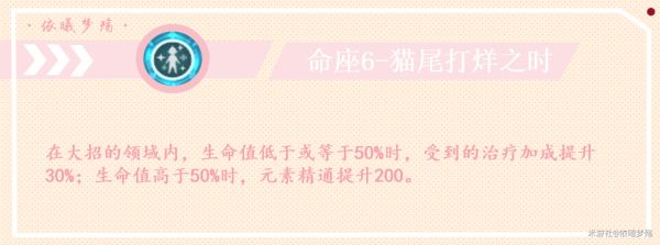 命座6层:迪奥娜开启元素爆发后,角色在大招领域内,如果生命值低于50%时,那么受到的治疗加成提高30%,而生命值高于50%时,那么在领域内的角色元素精通将会提升200点。这个命座可以打核爆使用,和班尼特加伤有点相像。